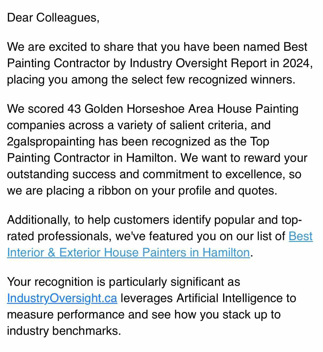 The 2Gals Team is honored to win the Industry Oversight Award for Hamilton's Best Painting Company! Thanks to everyone for their support!